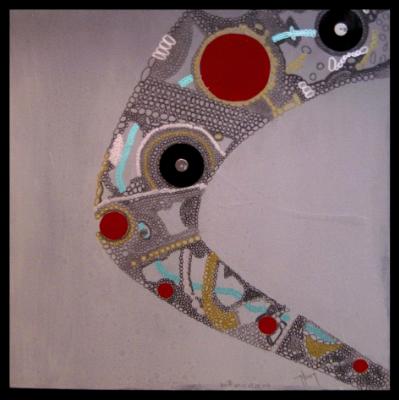 I started sketching and laying out my idea for this series in March 2012 and completed a total of 14 paintings in seven months. These paintings are in a variety of sizes, the smallest being 8x8 inches and the largest is 30x30 inches. The color scheme of each painting is based largely on a monochromatic color system in varying degrees of gray and black hues, which represents the lack of color in digital programming. I’ve incorporated a bit of color such as red, blue, purple, green, gold, silver or white for additional texture as a way to separate particular parts (partitions) of the painting from one another and give the painting a greater depth. The background is in flat gray and has a faint splattered effect to give imagination to a dropping or trickling of computer symbols or coding in the background. I used ink for all the drawing and incorporated additional items, mixed media into each painting.